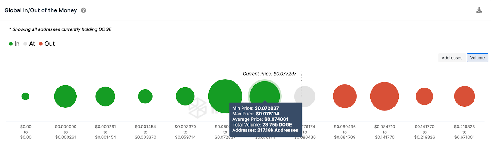 À medida que a Dogecoin perde impulso, o nível de suporte de US$ 0,075 pode ser crítico para evitar uma tendência de baixa prolongada. No entanto, conforme mostrado abaixo, os 217.000 investidores compraram 23,8 bilhões de tokens ao preço médio de US$ 0,074 podem oferecer um suporte.