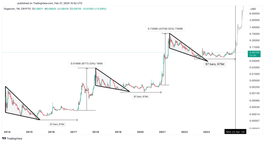 Entre dezembro de 2013 e maio de 2015, a criptomoeda meme exibiu uma queda no gráfico semanal. Isto foi seguido por um período de consolidação de 679 dias, culminando em um surpreendente salto de 8.773%. Um padrão semelhante se desenvolveu entre janeiro de 2018 e fevereiro de 2019, com a DOGE formando outra cunha de baixa, consolidando-se pelo mesmo período antes de disparar surpreendentes 23.740%.