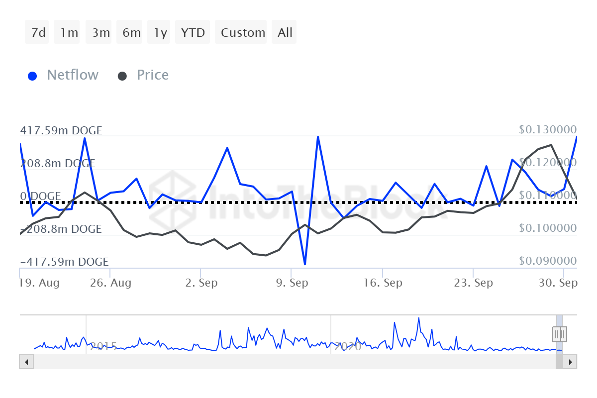 SponsoredNas últimas 24 horas, essas baleias registraram entradas líquidas totalizando 417 milhões de DOGE, no valor de cerca de US$ 45 milhões — o maior valor em quase um mês. Isso mostra, portanto, que os grandes detentores estão confiantes em um possível salto de preço.