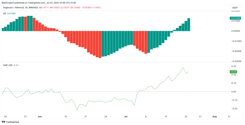 Além disso, o aumento do Chaikin Money Flow (CMF) da DOGE mostra uma entrada constante de liquidez no mercado. Atualmente em 0,23, o valor do indicador mostra uma entrada de capital no mercado da moeda meme, o que pode ajudar a sustentar a alta atual.
