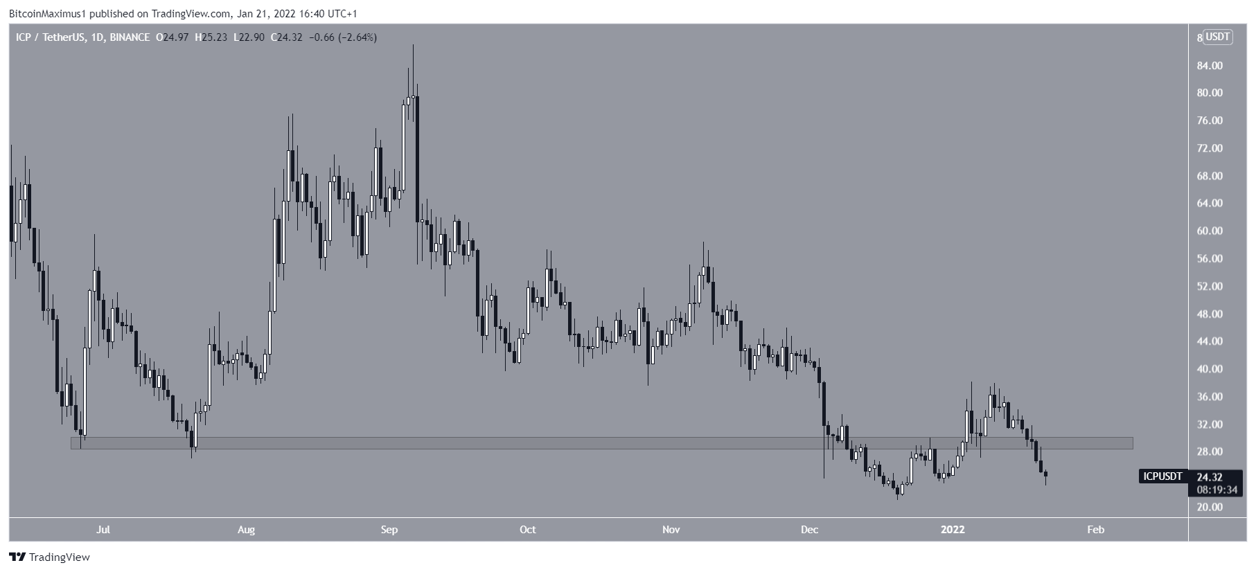 ICP está em queda desde 6 de setembro. No dia 20 de dezembro, o ativo atingiu a mínima histórica de US$ 20,88. Isso causou o rompimento da área de suporte horizontal de US$ 28,50. No entanto, o token recuperou a área logo depois subiu para US$ 38,02.