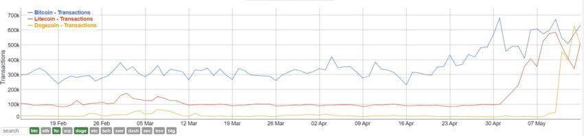 O desenvolvedor Inevitable360, do Dogecoin, foi ao Twitter para apontar o pico da moeda meme de cerca de 628.000 transações. Isso foi comparado às 575.000 transações do Bitcoin em 13 de maio.