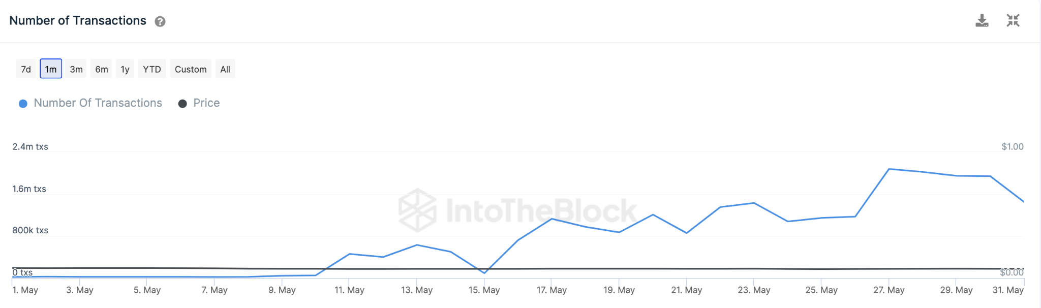 O gráfico abaixo mostra como a atividade da rede Dogecoin aumentou 8.200%, de 19.240 transações em 1º de maio para 1,45 milhão de transações registradas em 31 de maio. Enquanto isso, durante esse período, o preço da DOGE caminhou em direção oposta, caindo quase 10%.