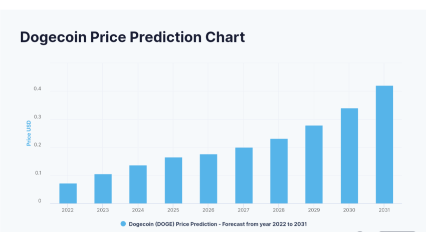 O Crypto Predictions tem uma previsão de preço da DOGE para 2022 que a vê sendo negociada a um preço médio de US$ 0,0823 até o final do ano. O token fechará 2023 marginalmente em US$ 0,0812. Ele deve terminar 2025 em cerca de US$ 0,0727, um aumento de mais de 23% em relação ao preço atual de US$ 0,0590.