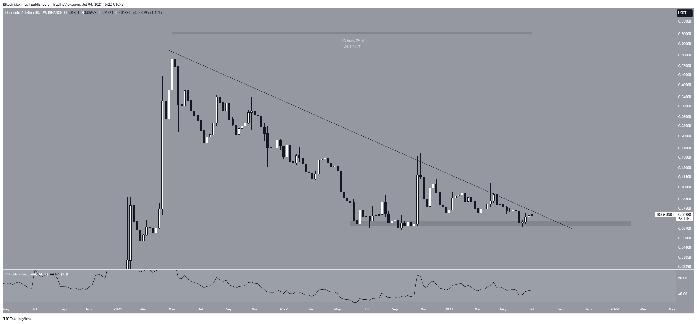 A análise técnica do gráfico semanal mostra que a DOGE caiu abaixo de uma linha de tendência de baixa desde sua máxima histórica de US$ 0,739 registrada em maio de 2021. A queda culminou com uma mínima de US$ 0,049 em junho do ano seguinte.