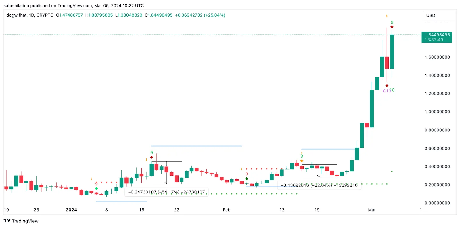 No entanto, os traders devem ter cuidado com a volatilidade potencial. O indicador Tom DeMark Sequential emitiu um sinal de venda no gráfico diário, sugerindo uma possível breve correção. Os dados históricos indicam que, seguindo tais sinais, o preço da WIF sofreu quedas significativas, variando de 33% a 54%.