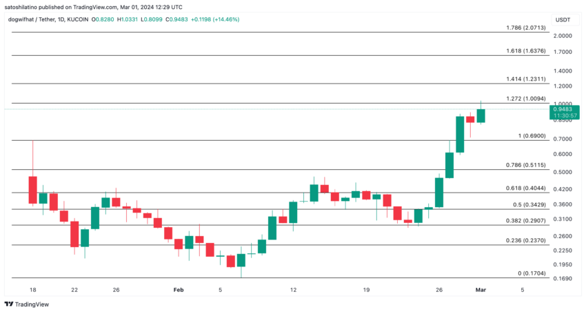 Agora, a Dogwifhat está se aproximando de um nível de resistência significativo em torno de US$ 1,02. Este nível também representa uma resistência psicológica onde os traders podem considerar a realização de lucros após os ganhos notáveis da semana.