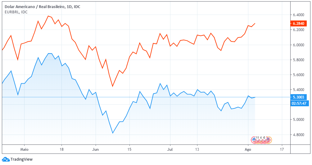 No entanto, o enfraquecimento do dólar fica aparente ao acompanhar a evolução do par Euro-Real. Ao contrário do que vinha acontecendo nos últimos meses, a diferença para o par Dólar-Real chegou a R$ 1.
