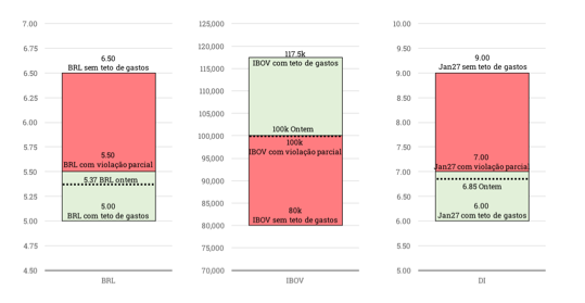 Como o sentimento geral é que a queda do Teto deteriore as contas, o mercado projeta freada na subida do IBOV. Além disso, a previsão nesse cenário seria de maior dificuldade de captar compradores de títulos da dívida pública.