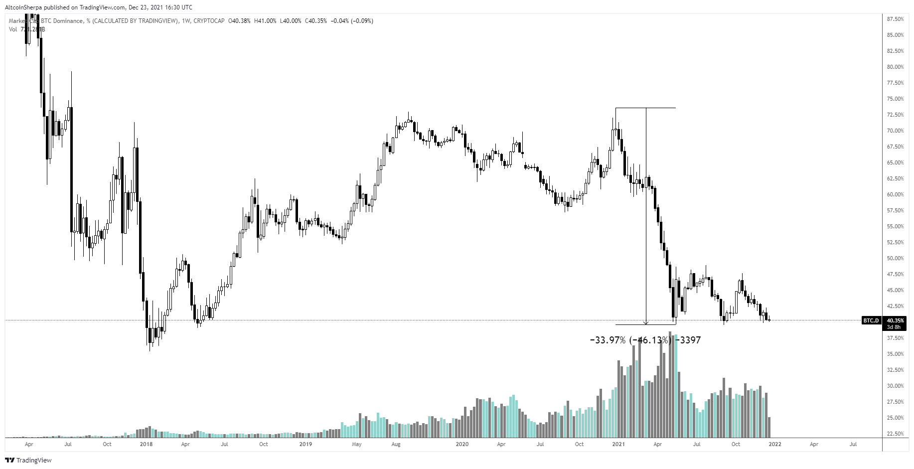 O trader de criptomoeda @AltcoinSherpa traçou um gráfico BTCD, onde mostra que a taxa caiu 46% desde as altas anuais. Conforme descrito acima, parece que o movimento descendente continuará.