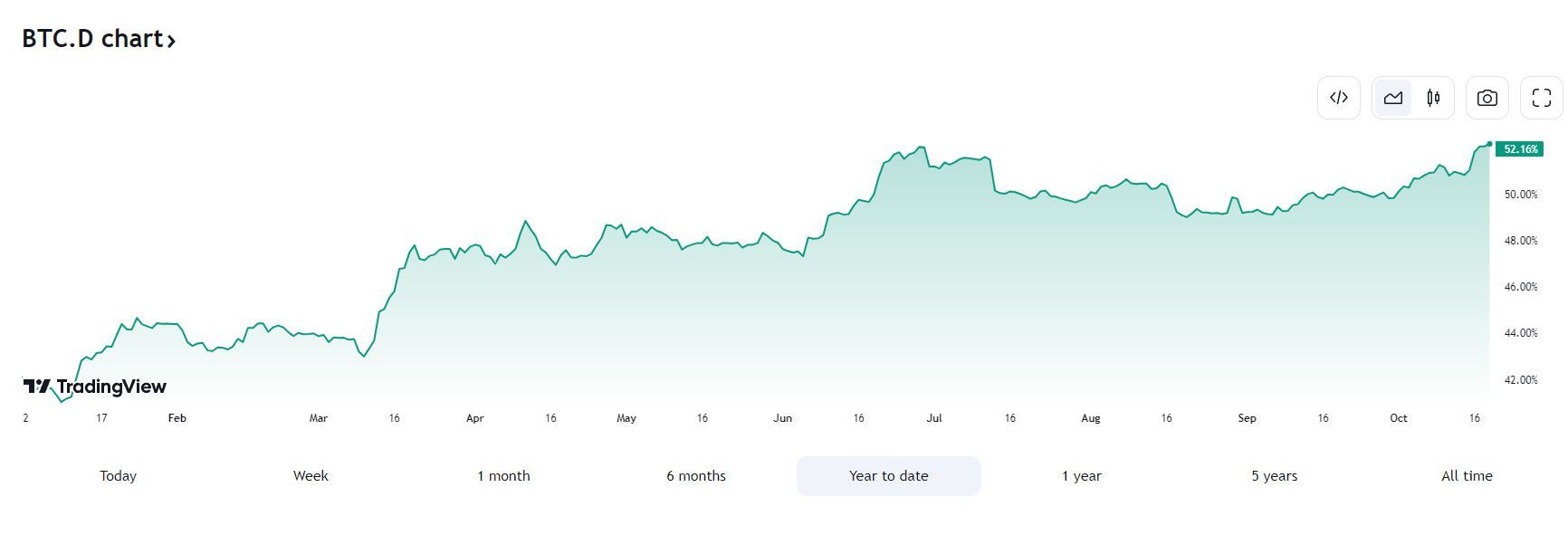 Nesta semana, a taxa de dominância do Bitcoin (BTCD) no mercado atingiu a porcentagem de 52,17%, nível mais alto no ano de acordo com o TradingView. A métrica ficou acima de 50% no final de junho, mas caiu para 49% em agosto.