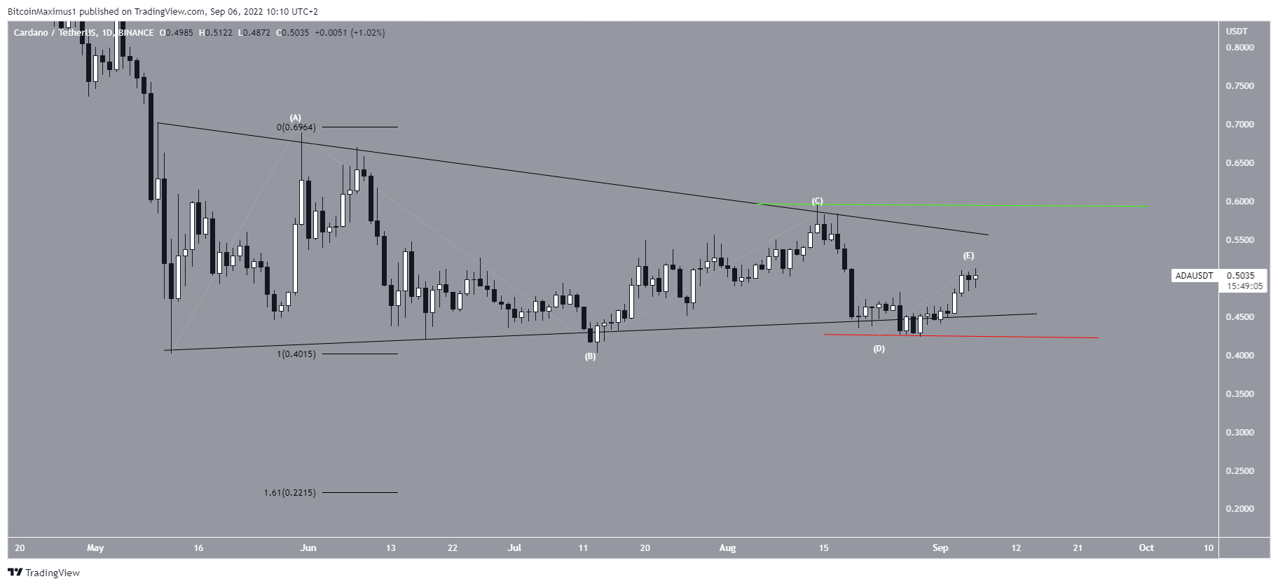 A ADA ultrapassar a alta de US$ 0,594 (linha verde) ou for rejeitada na baixa de US$ 0,423 (linha vermelha), provavelmente determinará a direção da tendência futura.
