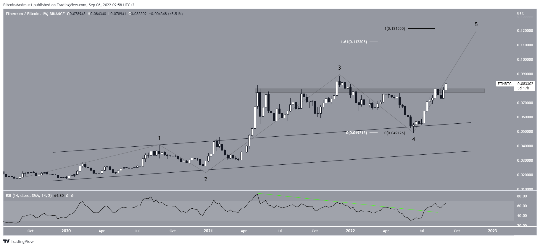 O ETH/BTC está subindo desde que atingiu um mínima de 0,049 satoshis em junho. Até agora, o par atingiu um topo de 0,084 nas últimas 24 horas. Este é quase o valor mais alto para o par desde o início de 2018, com o valor mais alto sendo de 0.088, alcançada em dezembro de 2021.
