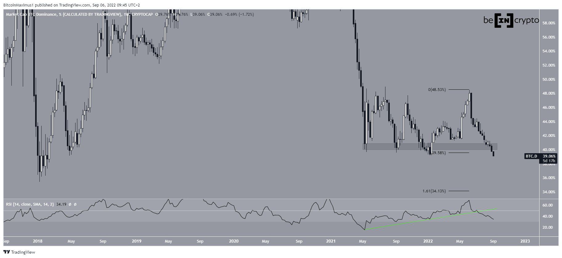O BTCD vem caindo desde então e atingiu uma mínima local de 39,07% nesta terça-feira (6), quebrando a área de suporte no processo. Além disso, o RSI semanal caiu abaixo de uma linha de tendência de alta (verde) que estava em vigor desde maio de 2021. Ambos são considerados sinais decisivos de uma tendência de baixa.