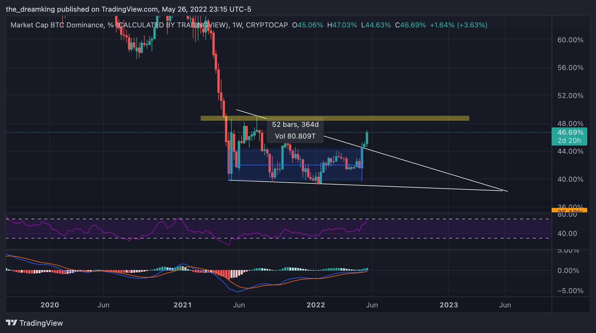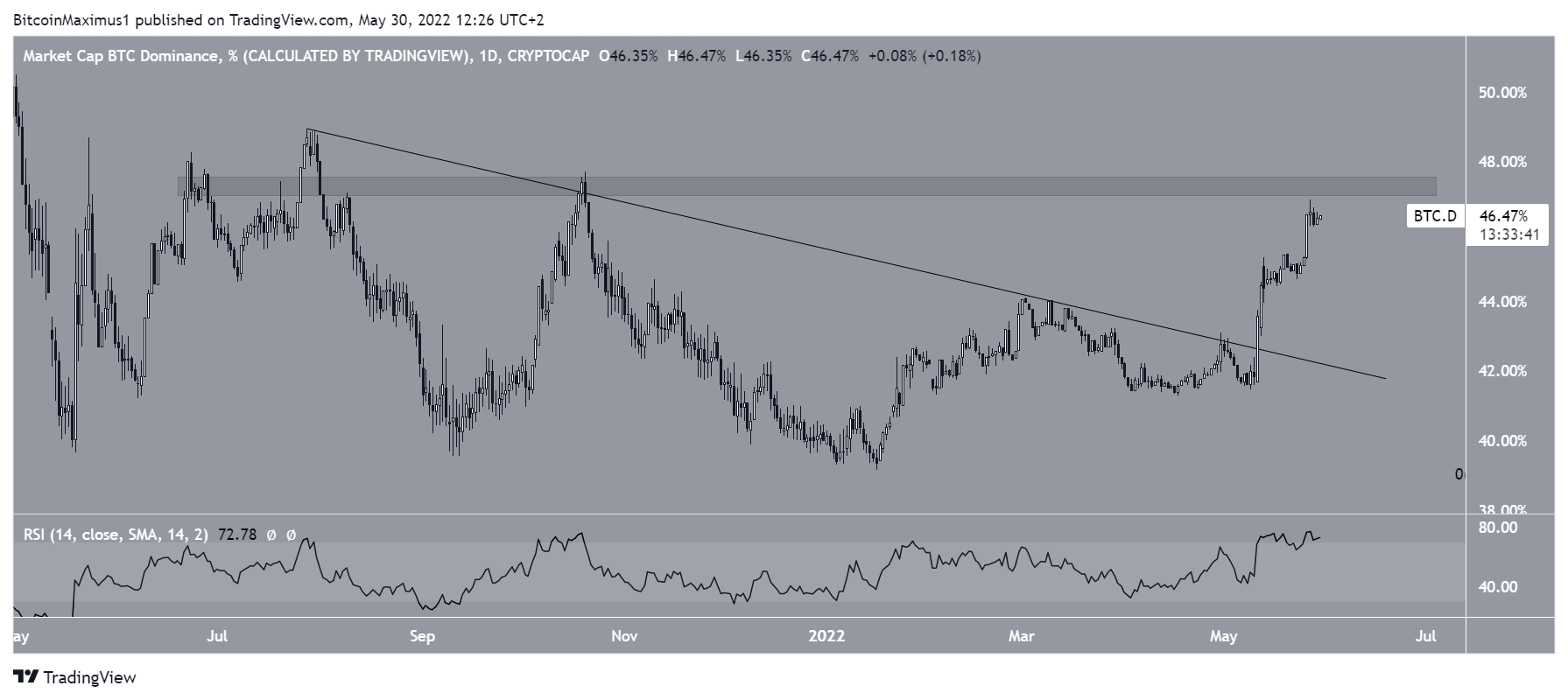 O rompimento é visível no gráfico diário e ocorreu em 11 de maio. Atualmente, o BTCD está se aproximando da principal área de resistência em 47%.