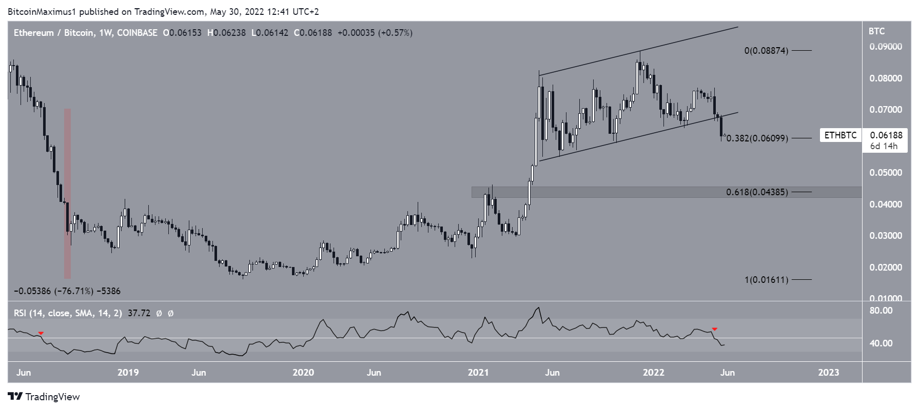 Como o Ethereum (ETH) é a maior altcoin em capitalização de mercado, seus movimentos têm um grande efeito no BTCD. Como resultado, vale a pena analisar o gráfico do par ETH/BTC para determinar se ele se alinha com a leitura da dominância do Bitcoin.