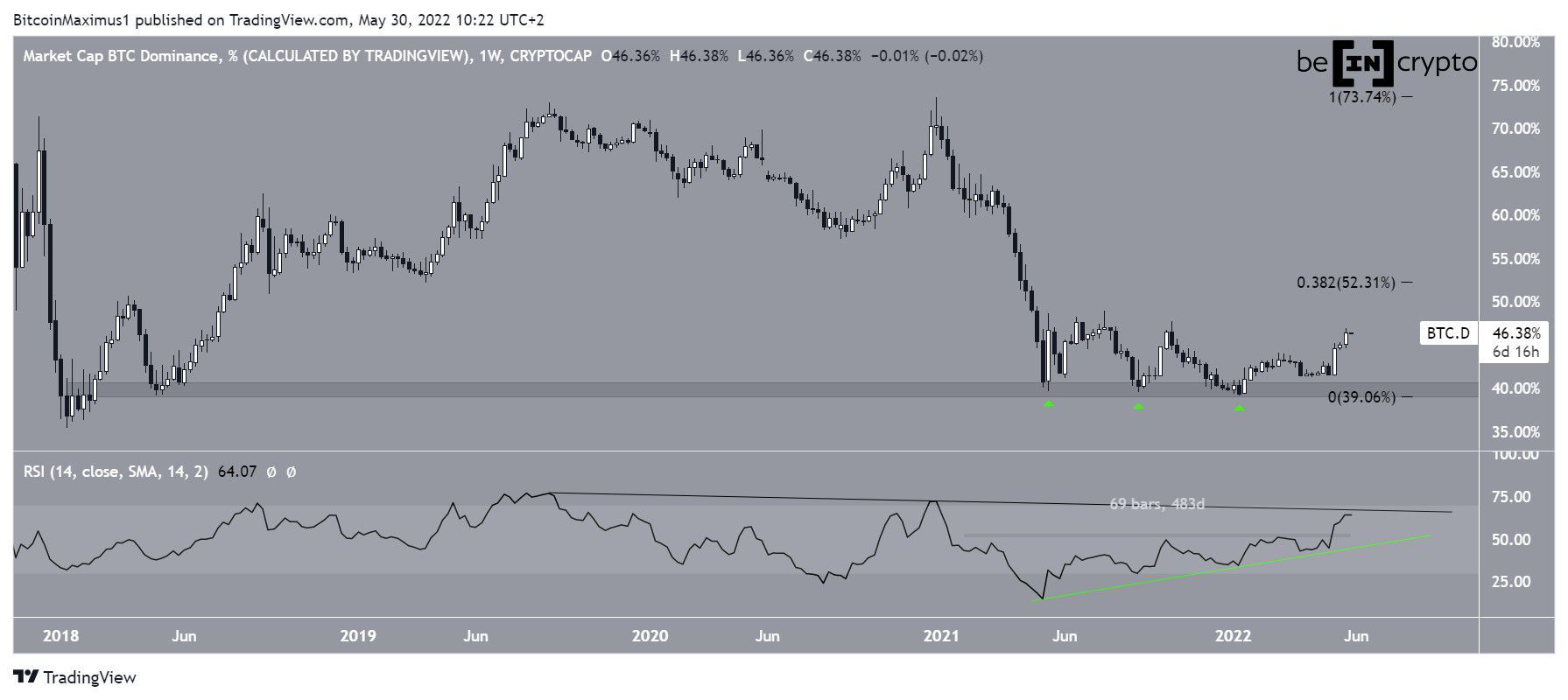 O BTCD atingiu uma mínima de 39,2% em janeiro de 2022, saltando na área de suporte de longo prazo de 40% pela terceira vez (ícones verdes). A taxa não havia atingido uma mínima abaixo desse nível desde o início de 2018. O salto até agora levou a uma alta de 46,90% na última sexta-feira (27).