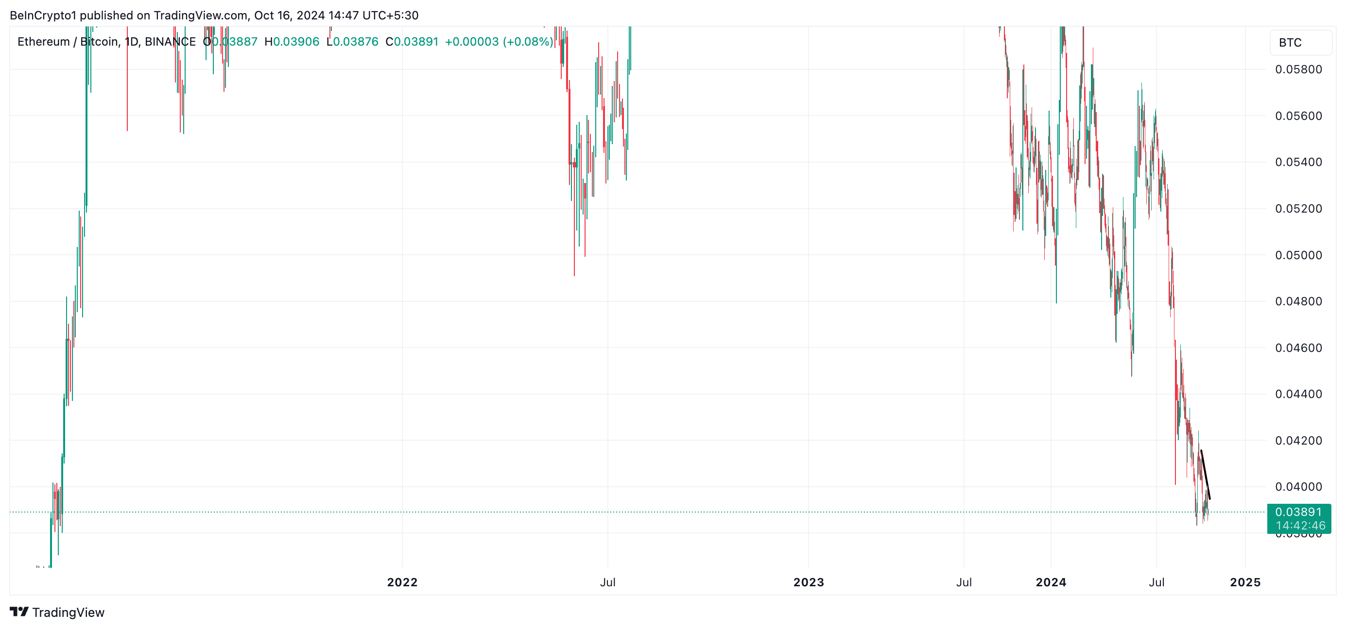 Além disso, a relação ETH/BTC, que acompanha o desempenho do Ethereum em comparação com o Bitcoin, está se aproximando de seu nível mais baixo em três anos e meio.