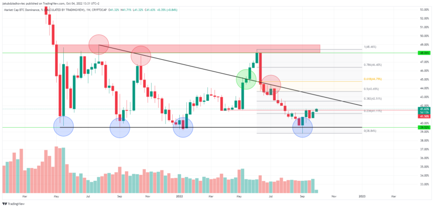 A dominância do Bitcoin vem se movendo em uma faixa de 39,50% – 48% desde maio de 2021. No gráfico semanal, podemos ver que o nível de 39,50% já foi confirmado como suporte quatro vezes (círculos azuis).