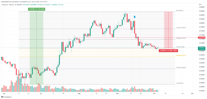 No entanto, pouco antes de 15 de setembro e a atualização entrar em vigor (seta azul), o ETH/BTC começou a perder valor consideravelmente. Até agora, o declínio levou ao suporte em 0,067 BTC em uma retração de 0,5 de Fibonacci. Isso corresponde a uma queda de 21% em relação ao pico de 0,085 BTC.