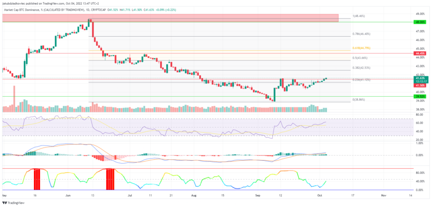 No entanto, o movimento acabou sendo falso e o domínio do Bitcoin retomou a negociação em uma estrutura de triângulo de baixa. Atualmente, o domínio do Bitcoin está lutando para romper acima da área de resistência em 41,50%. Se for bem-sucedido, a primeira área de resistência é a faixa de 42,50% a 43%.