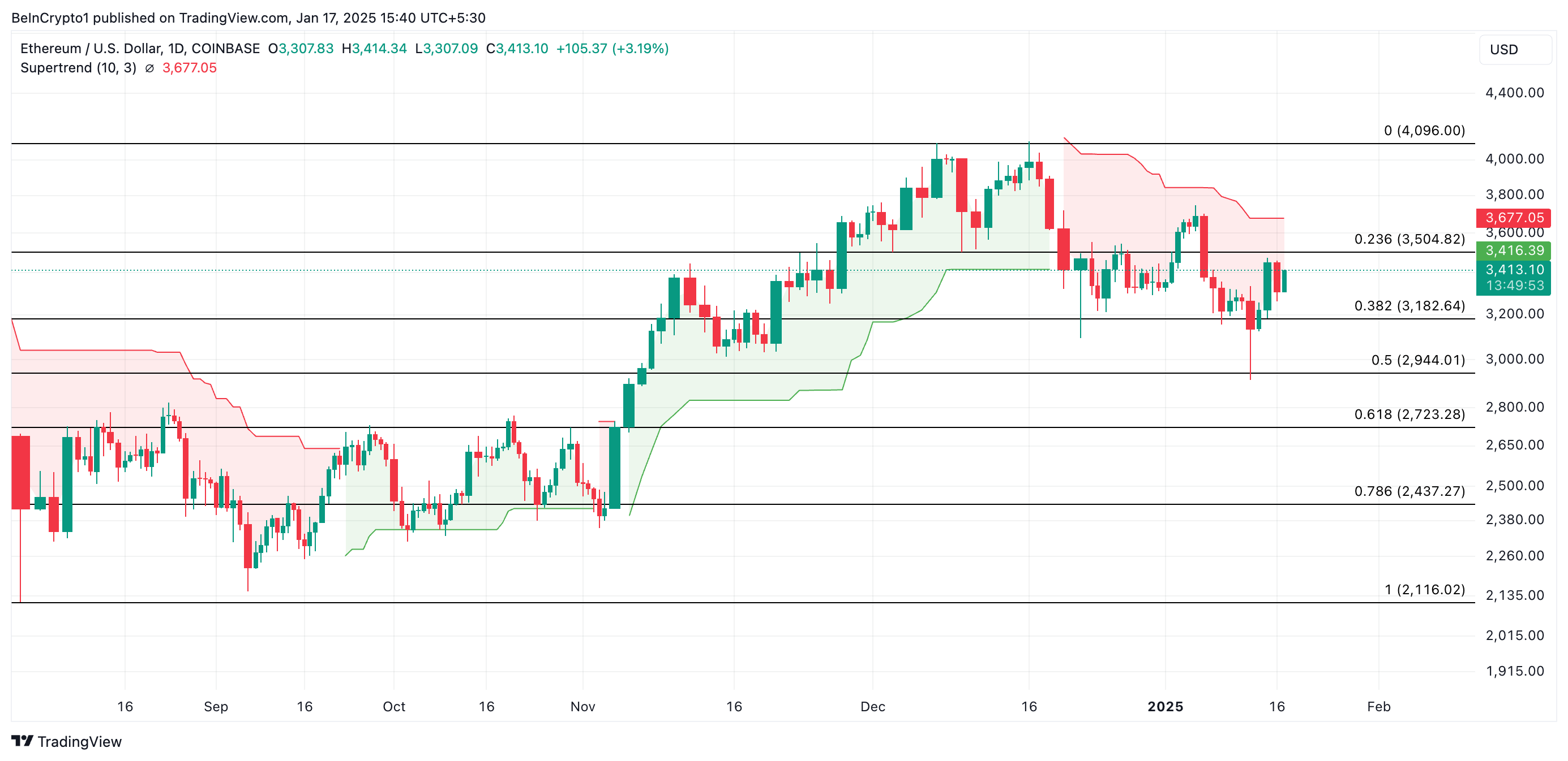 Além disso, a configuração do indicador Super Trend do ETH reforça essa perspectiva de baixa. No momento da publicação, ele está acima do preço da moeda, formando resistência em US$ 3.677.