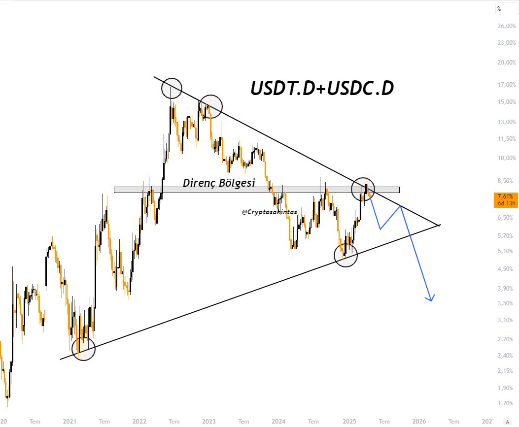 O investidor Cryptosahintas revelou que o índice combinado atingiu um nível crítico de resistência de 8% este mês. Isso é um sinal positivo para altcoins. Quando a dominância das stablecoins reage à resistência, muitas vezes sinaliza que o capital pode estar se preparando para fluir para outras moedas, potencialmente desencadeando uma forte alta de preços.
