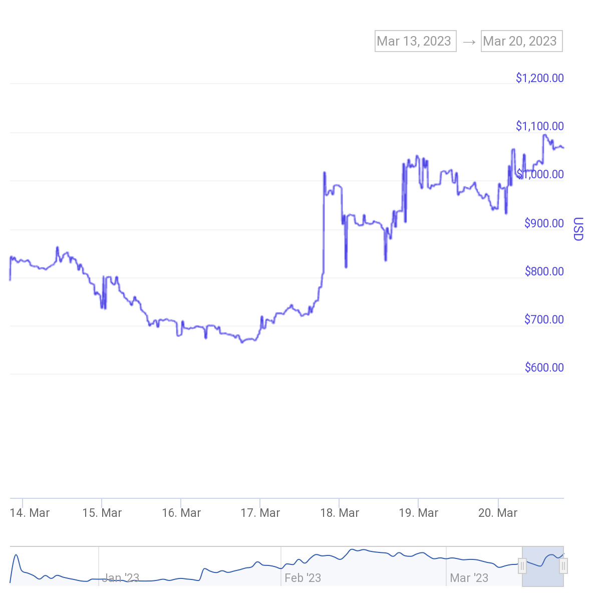 O preço dos NFTs não conseguiu se sustentar e caiu em seguida. Por outro lado, ele voltou a se recuperar e, no momento em que este artigo era escrito, era avaliado em US$ 1.067 cada. A valorização foi de 8,3% nas últimas 24h.