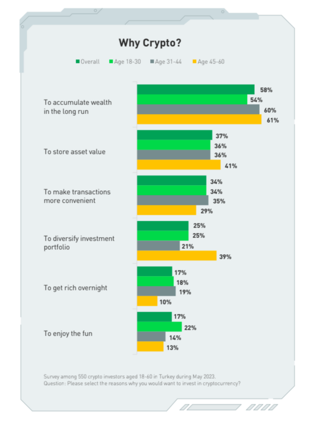 As criptomoedas se tornaram uma forma de investimento cada vez mais popular na Turquia, especialmente como proteção contra a inflação galopante e após a desvalorização da lira. Uma pesquisa descobriu que os investidores estão adotando esses ativos com o objetivo de gerar riqueza à longo prazo, em vez de obter um retorno rápido.