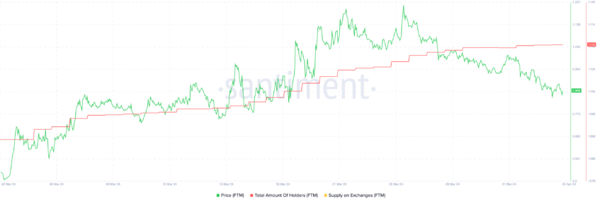 Entre 17 e 28 de março, a Fantom testemunhou um aumento significativo no número de detentores. A métrica cresceu de 109.930 para 111.280, com uma média de 122 novos titulares por dia, juntamente com um salto significativo de preço de US$ 0,78 para US$ 1,03.