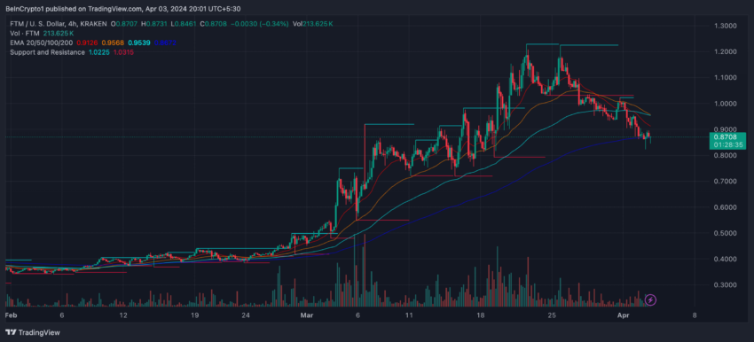 As médias móveis exponenciais (EMAs) no gráfico de 4 horas do Fantom formaram um cruzamento de baixa. Esse é um padrão técnico gráfico que indica o potencial para uma venda significativa. Ele ocorre quando uma EMA de curto prazo cruza abaixo de uma média de longo prazo.
