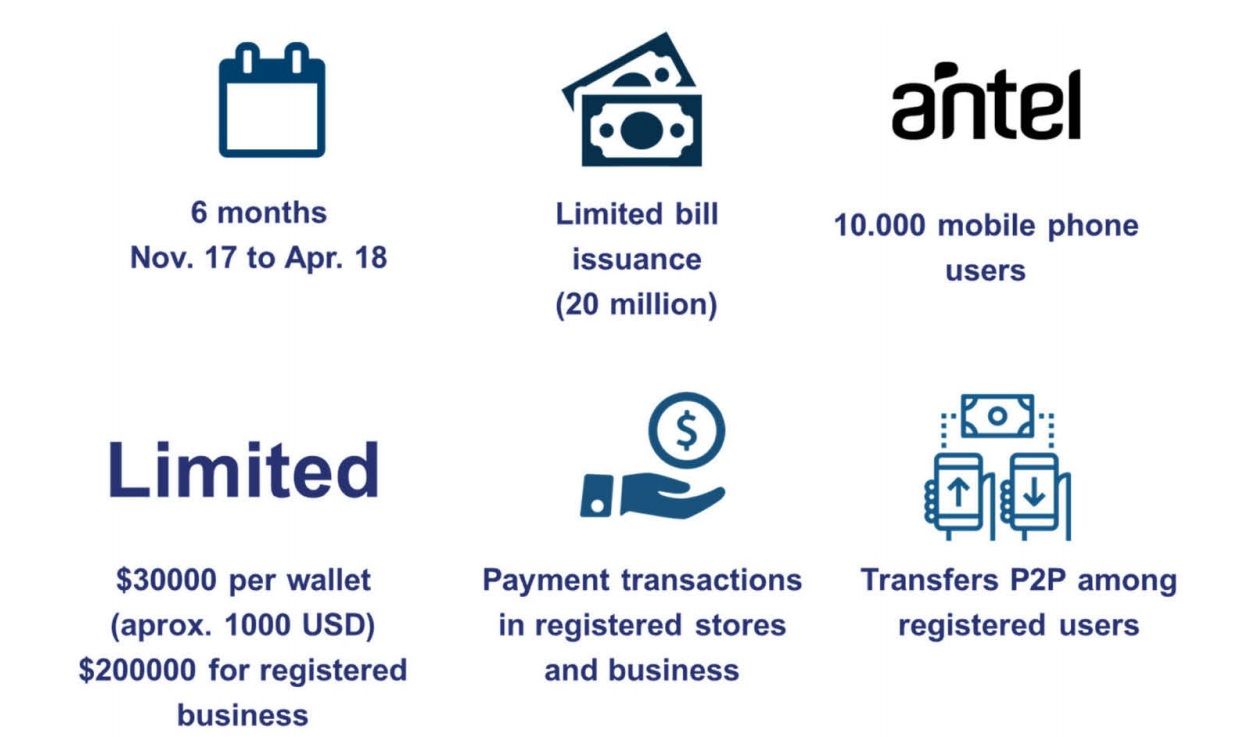 Para se qualificar para o projeto piloto da moeda digital e-Peso, os usuários precisariam ser assinantes ativos da rede estatal Antel. As autoridades aprovaram um total de 10.000 usuários para criar carteiras por ordem de chegada. A empresa de pagamentos de terceiros, RedPagos, carregaria tokens nessas carteiras.