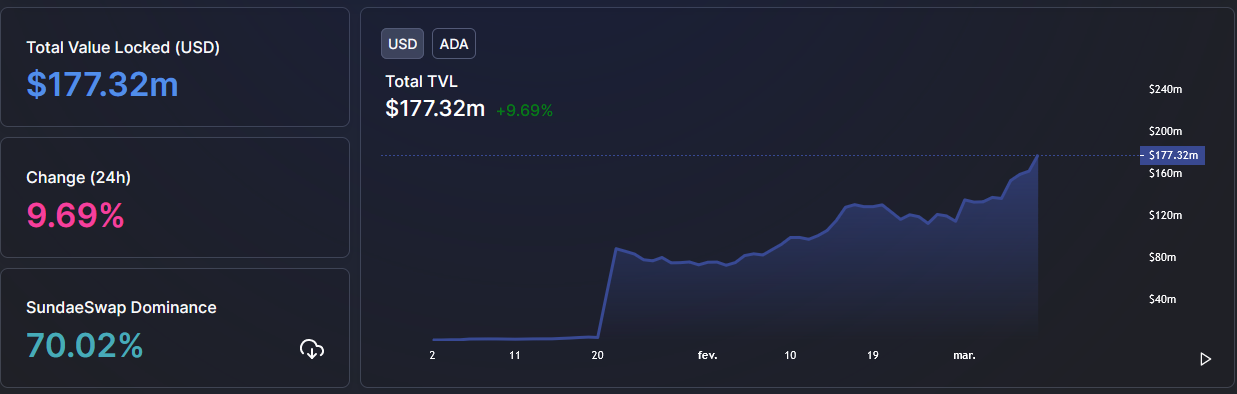 Em primeiro lugar está a própria SundaeSwap, com TVL de US$ 124 milhões – cerca de 70% de todo o valor depositado na Cardano, que atingiu uma nova máxima de US$ 177 milhões nas últimas 24 horas.