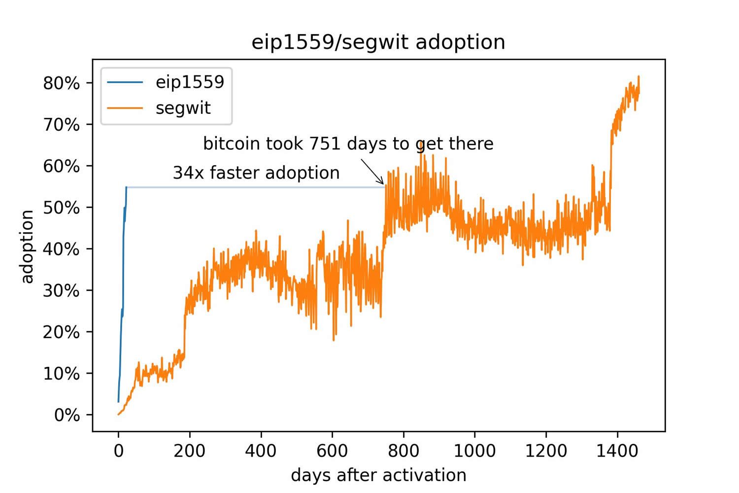 Ele comparou isso com a atualização EIP-1559 da Ethereum, que está no ar há apenas 3 semanas e já ganhou 55% de adoção, se tornando 34 vezes mais rápido do que a adoção do Segwit.