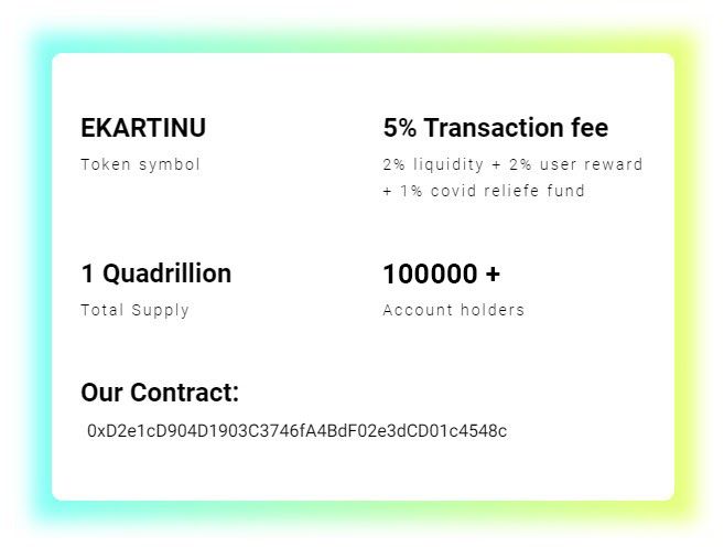 Enquanto outras plataformas cobram uma taxa de 10%, a Ekart INU fez uma nova tentativa de devolver à comunidade local o máximo que puder. Do total de 10%, 5% será a taxa de transação. 2% voltam para o usuário, 2% é a liquidez e o 1% restante irá contribuir para o fundo de alívio à covid-19.