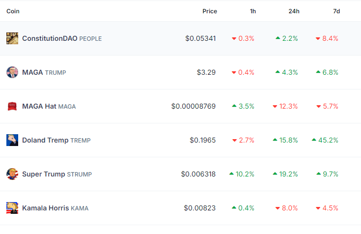 Sponsored SponsoredDe acordo com dados da CoinGecko, as moedas meme PolitiFi já estão apresentando volatilidade na expectativa do debate, com algumas moedas inspiradas em Trump registrando ganhos de dois dígitos.