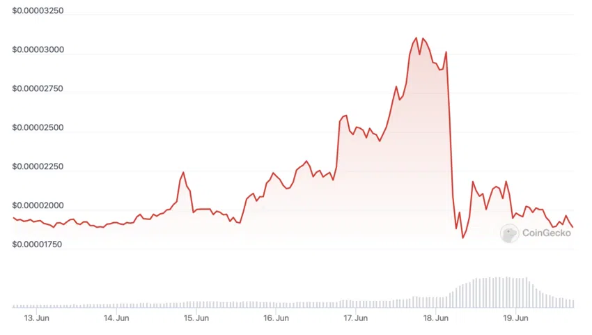 O preço do token BOB reagiu ao banimento e despencou 48,38%. Ele passou de US$ 0,00031 a US$ 0,000018.