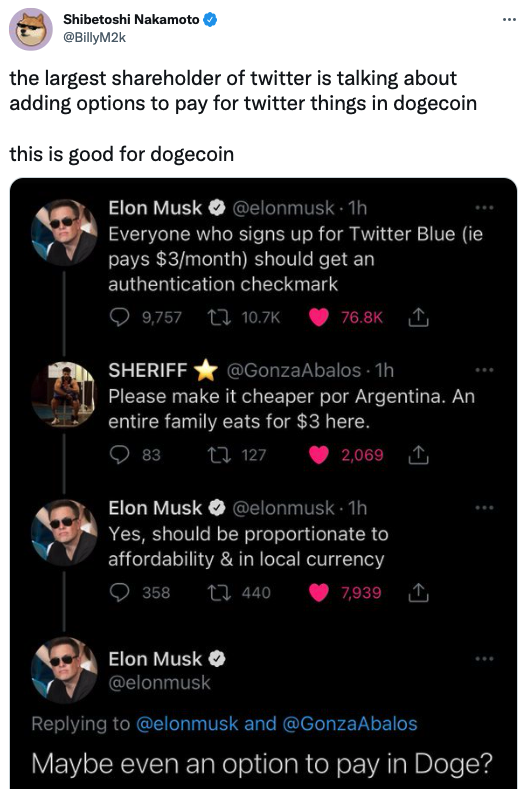 “O maior acionista do Twitter está falando em adicionar opções para pagar por coisas do Twitter em Dogecoin