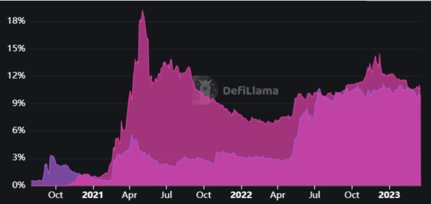 Dados do Defillama mostram que a TRON domina 10,8% do universo DeFi. Já a Binance Smart Chain está em terceiro lugar, com 9,8%.