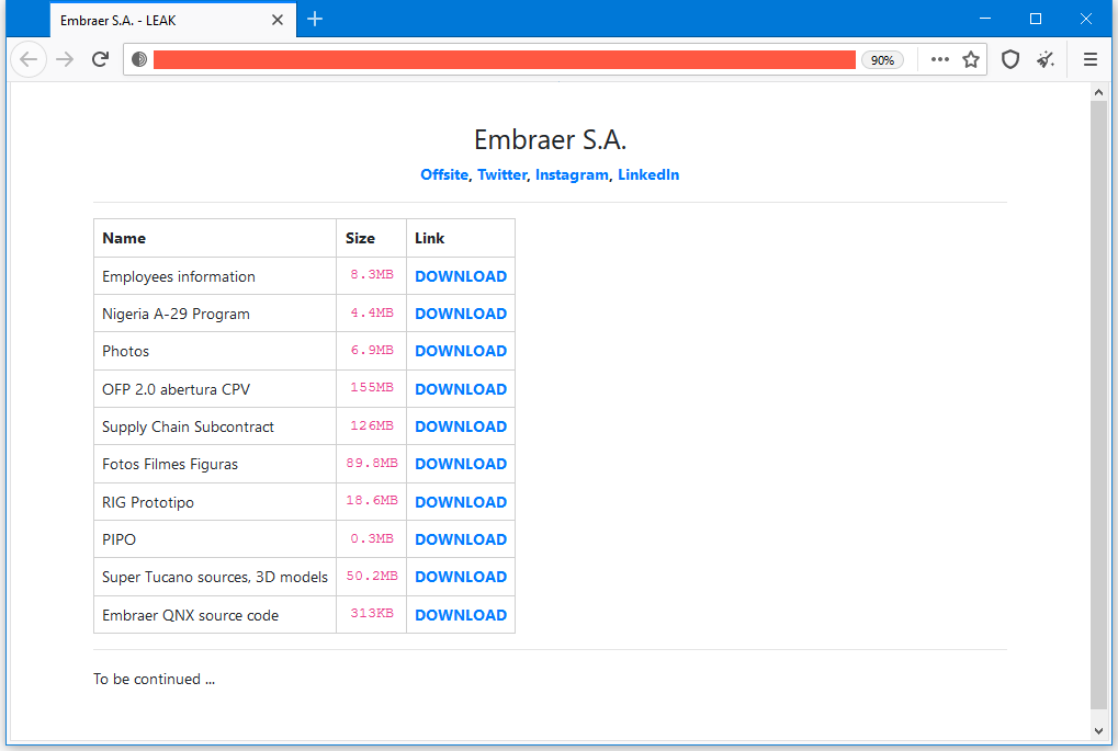 Também conhecido como Defray777, o grupo disponibilizou amostras de diversos tipos de dados roubados, como, por exemplo, informações de funcionários e contratos comerciais. O pacote também traz código-fonte de software desenvolvido internamente pela Embraer.