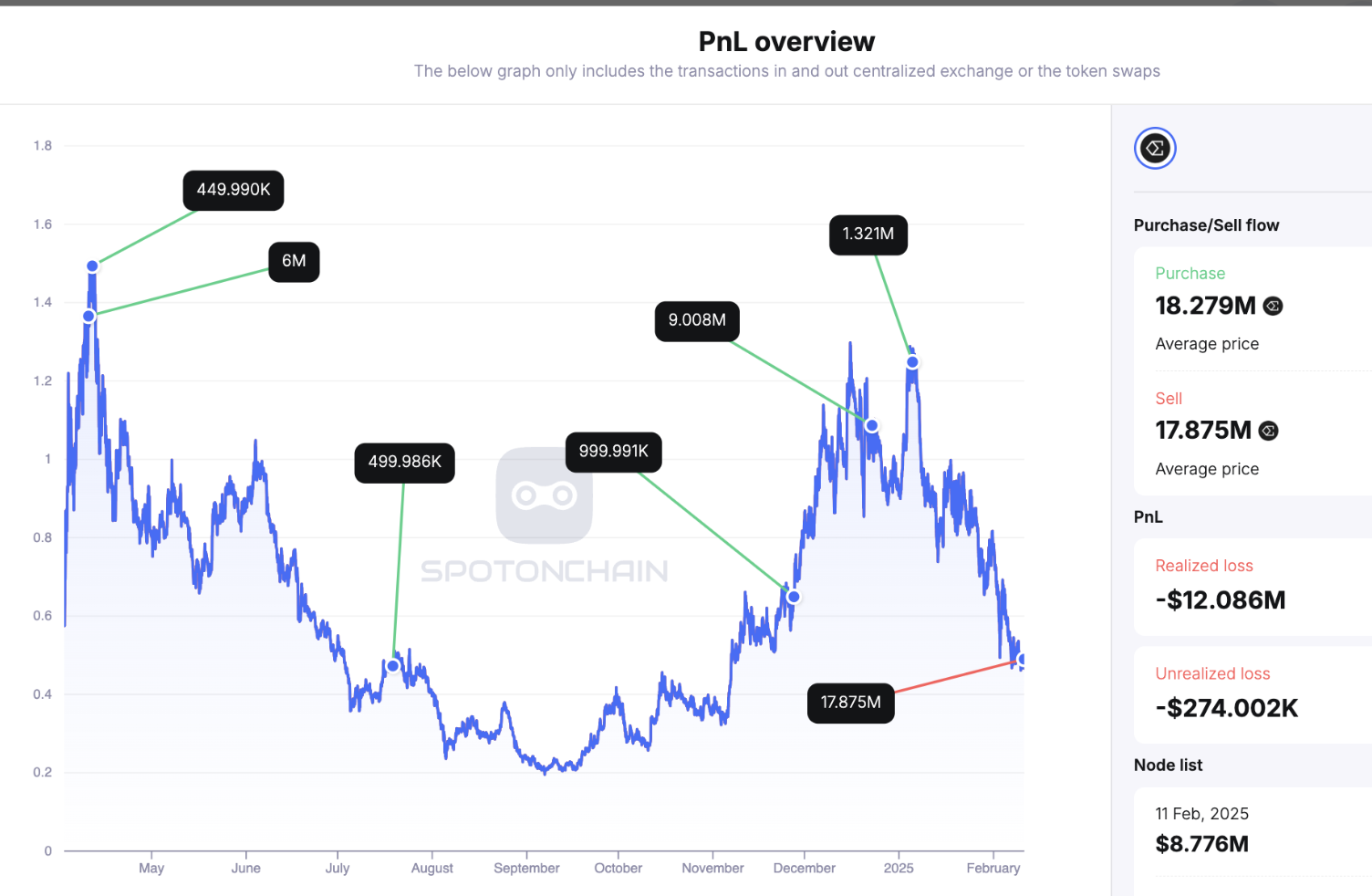 SponsoredDe acordo com o investigador on-chain Spotonchain, essa baleia acumulou a ENA a um preço médio de compra de US$ 1,167, principalmente durante picos de preço. Com a altcoin atualmente cotada a US$ 0,43, vender nesse nível resultaria em uma perda significativa para a baleia.