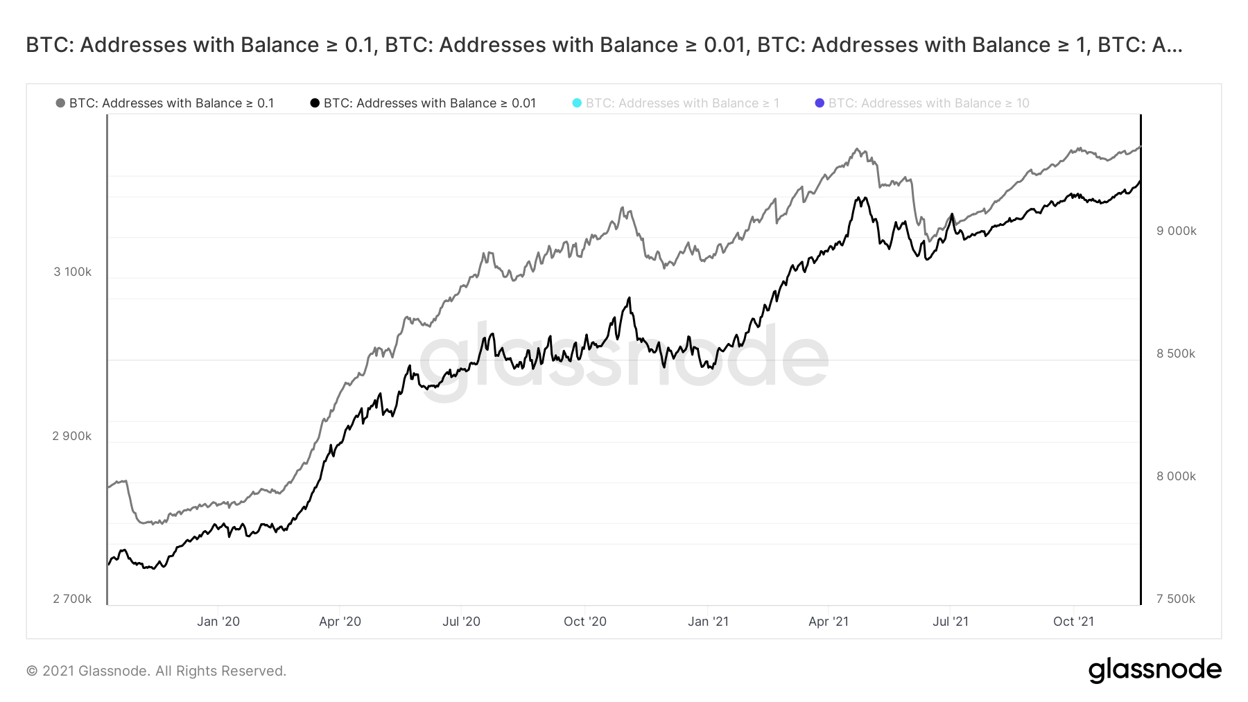 O aumento de endereços é especialmente prevalente em contas pequenas (aquelas que possuem entre 0,01 e 1 BTC). Contas com mais de 0,01 são mostradas em preto, enquanto aquelas com mais de 0,1 são mostradas em cinza. Seu movimento reflete principalmente o número total de endereços.