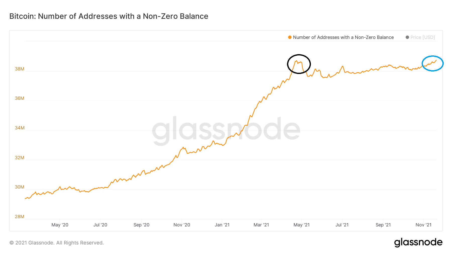 O número de endereços de Bitcoin tem aumentado constantemente desde março, quando estava abaixo de 30 milhões. Em 23 de abril, atingiu até então o recorde de 38.704.373 (círculo preto). A maior alta de todos os tempos quase coincidiu com a alta do preço BTC de 14 de abril.