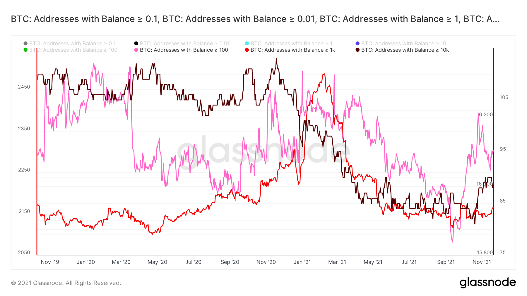 Por fim, o número de contas com mais de 100 BTC é semelhante ao das contas de médio porte. A principal diferença é que as o número de baleias atingiu seu máximo histórico consideravelmente antes das contas médias entre outubro e dezembro de 2020.