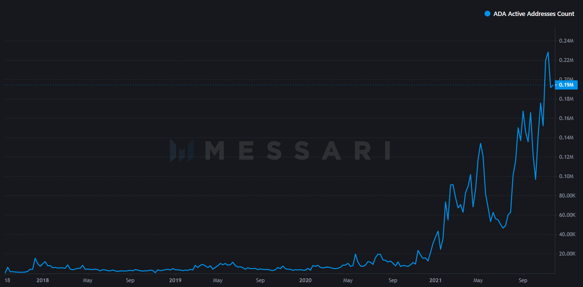 O número de endereços ativos na Cardano saltou mais de 25% em novembro de 2021, segundo dados do Messari. A contagem de endereços ativos atingiu o pico em mais de 485.000, embora agora esteja em pouco mais de 191.500. No início do mês, o número girava em torno de 161.000.