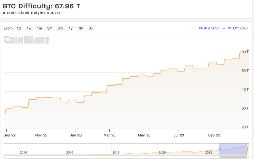 Na verdade, a validação do Bitcoin por meio de prova de trabalho é uma tarefa que consome muita energia, exigindo enorme poder de computação. No momento em que escrevo, a dificuldade do Bitcoin é de 67,96 terahashes por segundo. A métrica mede a dificuldade de mineração de um bloco de Bitcoin em terahashes.