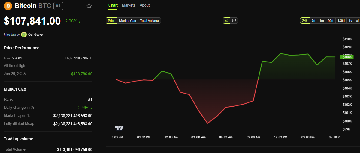 No momento da publicação deste artigo, o Bitcoin estava sendo negociado a US$ 107.841. Isso representa um aumento modesto de quase 3% desde a abertura da sessão de segunda-feira e segue o recente recorde histórico do BTC de US$ 109.588 na Binance.