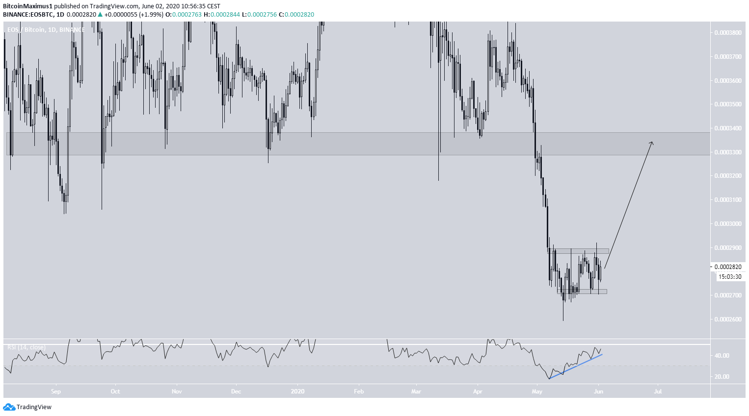 Durante a ascensão do BTC, a EOS caiu até a área de suporte de 27.100 satoshi. No entanto, também criou uma sombra inferior muito longa e subiu imediatamente depois. Este é um sinal de considerável pressão de compra.