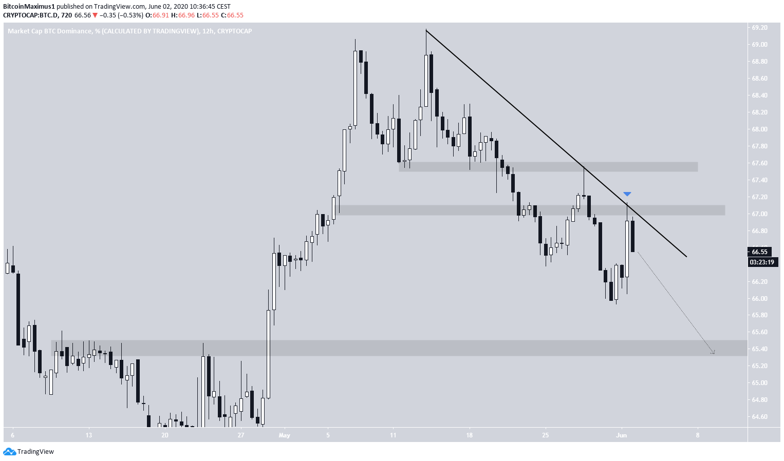 Ontem à noite, a taxa de dominância do Bitcoin (BTCD) aumentou rapidamente durante a subida do Bitcoin acima de US $ 10.000 . No entanto, caiu acentuadamente após atingir a linha de resistência descendente formada desde 14 de maio. É provável que agora essa área de 67% atue como resistência.