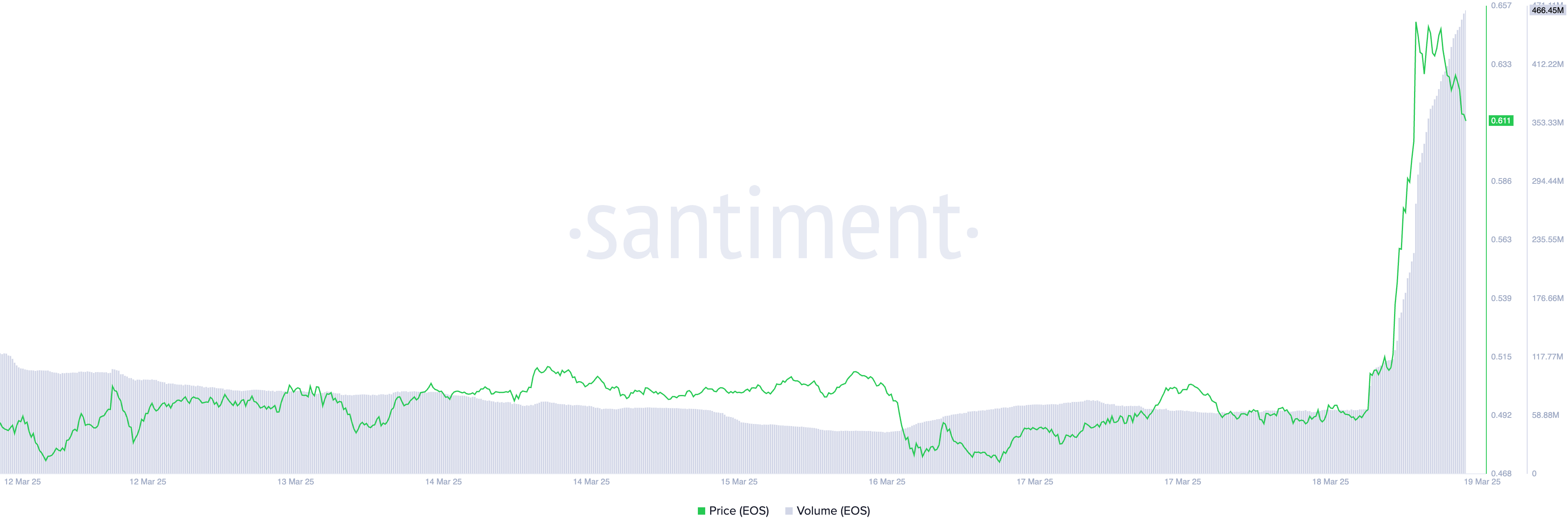 Quando o preço e o volume de negociação de um ativo sobem assim, isso indica forte atividade de mercado impulsionada por alta pressão de compra. Essa combinação sinaliza um momento de alta nos mercados à vista da EOS, sugerindo aumento da demanda e potencial para uma valorização contínua do preço.